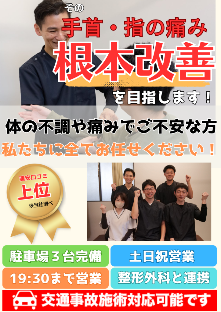 【SBC東京接骨院(浦安市富士見)】では、手首や指の痛みの根本原因にアプローチし、症状の早期改善と再発防止をサポートしています。